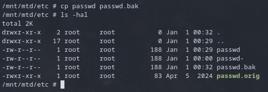 mount --bind /mnt/mtd/etc/passwd /etc/passwd