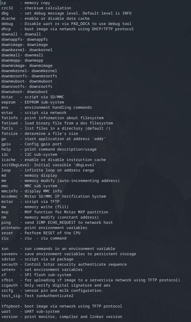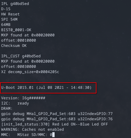 baudrate=115200 bootargs=console=ttyS0,115200 root=/dev/mtdblock2 rootfstype=squashfs ro init=/linuxrc LX_MEM=0x3fe0000 mma_heap=mma_heap_name0,miu=0,sz=0x1200000 bootcmd=gpio out 77 1;gpio out 76 0;gpio out 61 0;sf probe 0;sf read 0x22000000 0x50000 0x200000; bootm 0x22000000 bootdelay=0 stderr=serial stdin=serial stdout=serial Environment size: 346/4092 bytes