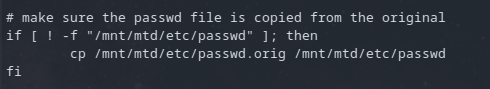 The script is taking a backup file and replacing the passwd file before binding to the squasfs