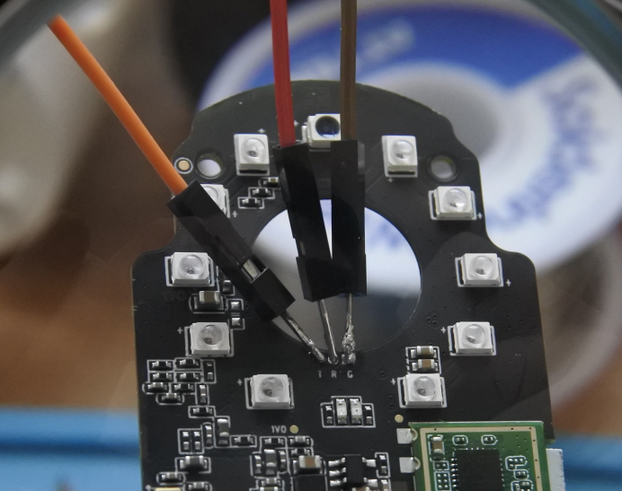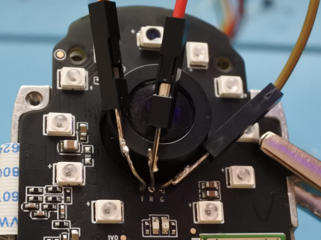 Unfortunately I didn't consider the gauge of the through holes when I noticed the UART port in the FCC report. My jumper wires were too big to go through so my first attempt was to solder the through holes and pins of the jumper wires before attempting to solder them together. This worked ok until I realized I needed to connect this board to the other board of the device (see FCC report photos) and the wires were in the way of the camera lens.
