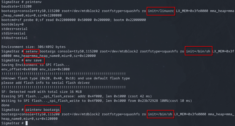 Using the printenv command we can see the init=/linuxrc section. Now with the setenv command we can replace the init=/linuxrc with init=/bin/sh.