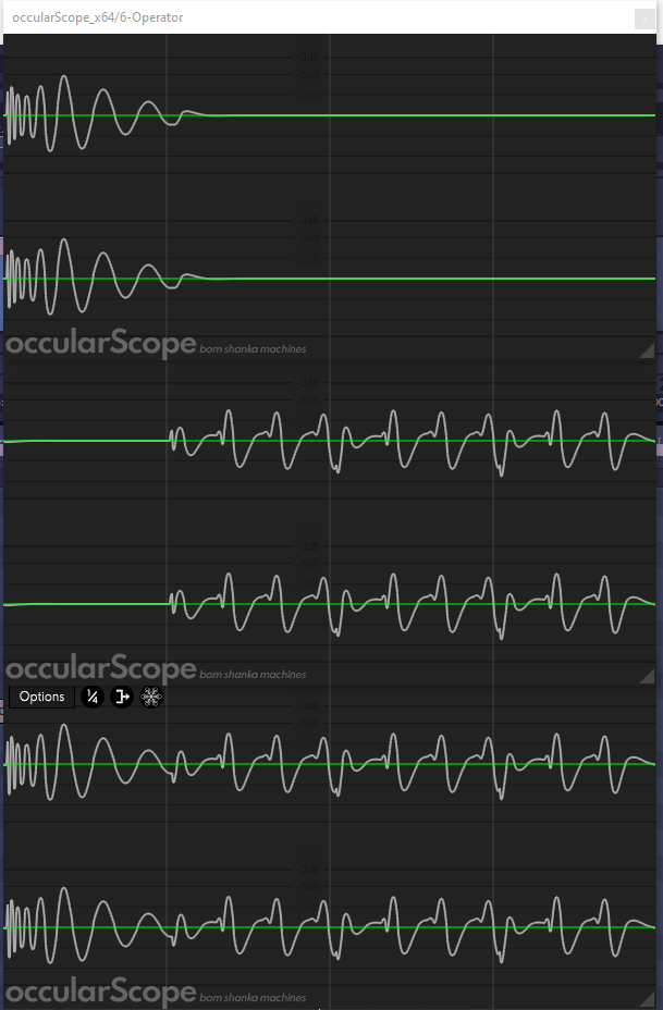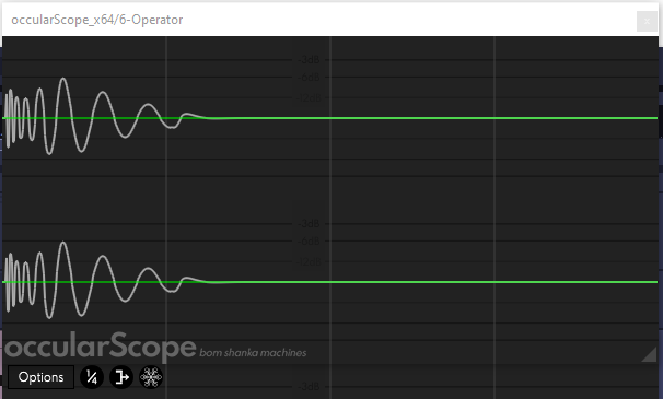 So what can be done about this? Taking a psytrance kick and bass pair into consideration, the tail end of the kick should be completely finished by the time the bass note immediately after begins. This is extremely difficult to hear so we'll need to view our waveforms with an oscilloscope. I use occularscope from Boom Shanka machines. Loading up an Operator plugin to make my basic sinewave kick. Making sure to bring everything in so the tail end of the kick is not eating in to the area where the bass note is playing. This Kick is a C0 (32.7Hz) sinewave sweep down from +48semitones and the amplitude envelope was set to make everything fit within the first 16th note.