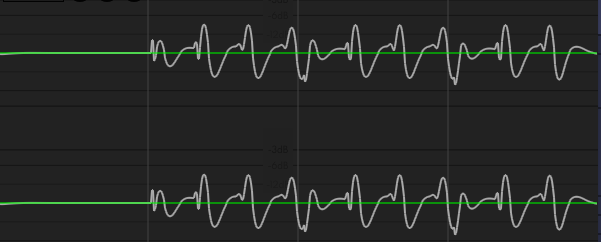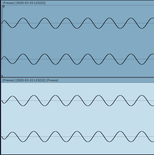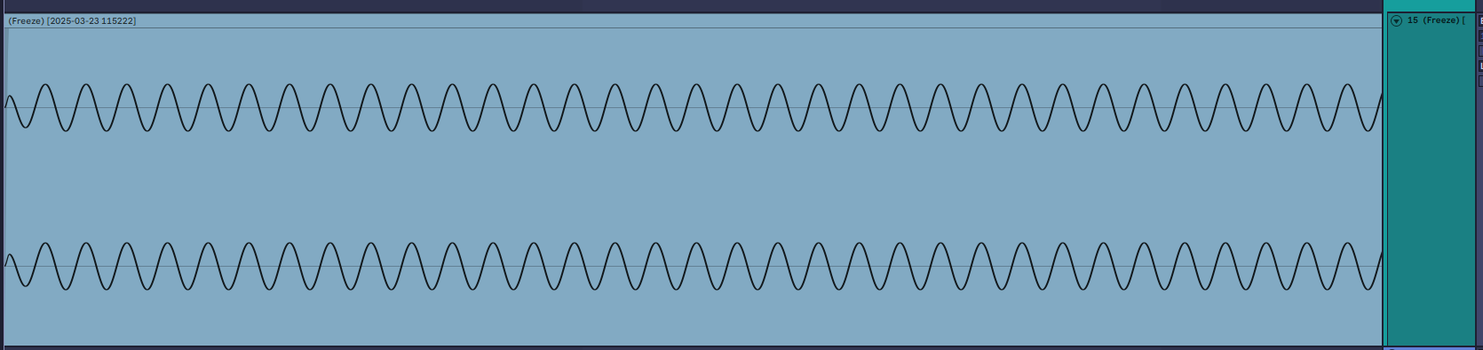 then freeze the track and drag and drop the sample to a new audio track. Unfreeze the first audio track and remove the utility plugin and we now have two sinewaves at the same frequency but opposite phases. You can see that the peak of one waveform occurs at the same point in time as the valley of the other. Now if you solo one track you'll hear the sine wave but as soon as you bring in the other track, the audio will go quiet. This is because the speaker cone is receiving equally opposite voltage values that result in a sum of 0. +1 + -1 = 0, +2 + -2 = 0, and so on.