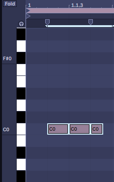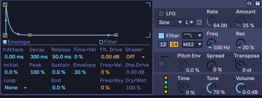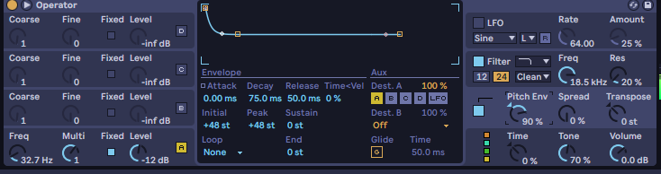 the small bit of waveform that is occupying the 2nd 16th note isn't too much of a concern since it's amplitude is fairly low. Next we want to ensure that the bass line isn't doing the same for the kick drum's initial hit. This bassline is made using operator and and 1 sawtooth wave playing 16th notes at C0. the filter cutoff is ~100Hz and modulated with the filter envelope.